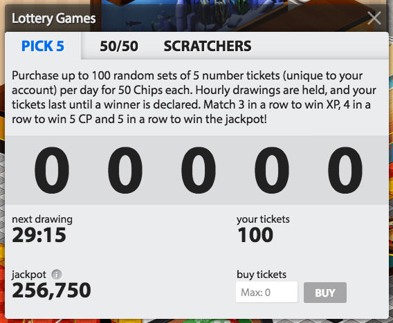 Purchase up to 100 random sets of 5 number tickets (unique to your account) per day for 50 Chips each. Hourly drawings are held, and your tickets last until a winner is declared. Match 3 in a row to win XP, 4 in a row to win 5 CP and 5 in a row to win the jackpot!