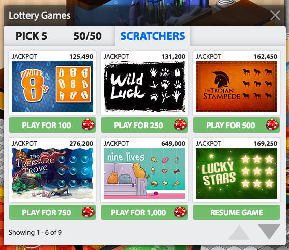 Select from one of several themed scratch-off instant win cards, such as Amazing 8's or Nine Lives. Click the scratch-off areas to reveal numbers one at a time, or pick AUTO SCRATCH to reveal them all at once. If you manage to match 3 numbers, you'll receive the prize listed below those numbers, which may be Chips, Casino Points, a free Scratcher ticket or the JACKPOT! There is a unique progressive jackpot for each scratcher card.